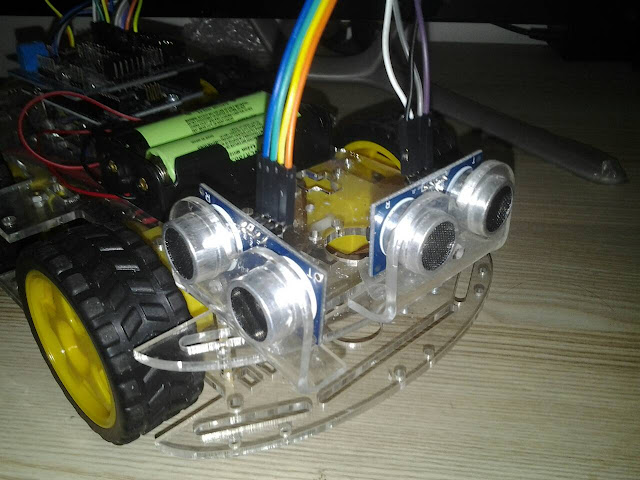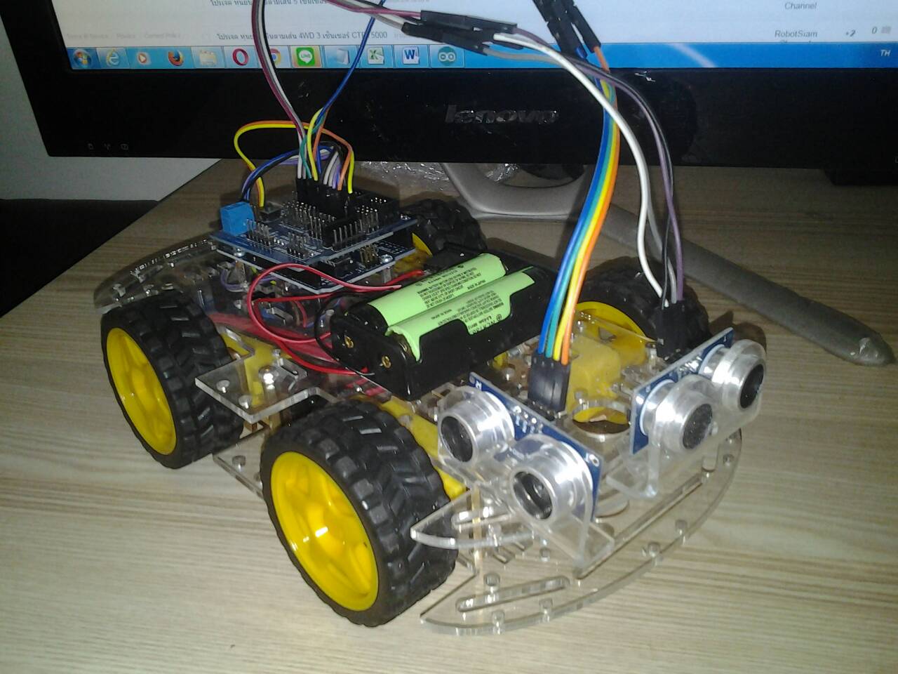 ถ้าทุกอย่างถูกต้อง ทดลอง ยกลงวางที่พื้นแล้วทดสอบ อีกครั้ง ถอด แบตเตอรี่ออก (หรือ ปิดเปิด สวิทช์ไฟใหม่) แล้วใส่เข้าไปใหม่ ถ้าทุกอย่างถูกต้อง รถจะเคลื่อนไปข้างหน้า-ถอยหลัง แล้ว เลี้ยวซ้าย แล้ว จึงเลี้ยวขวากลับสู่ตำแหน่งเดิม เชื่อมต่อ เซ็นเซอร์ HC-SR04 ตัวที่ 1 กับ Sensor Shield V5.0 ดังรูป
