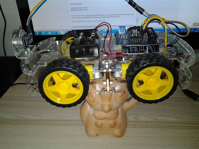 //Define high-level H-bridge commands void enableMotors() { motorAOn(); motorBOn(); } void disableMotors() { motorAOff(); motorBOff(); } void forward(int time) { motorAForward(); motorBForward(); delay(time); } void backward(int time) { motorABackward(); motorBBackward(); delay(time); } void turnLeft(int time) { motorABackward(); motorBForward(); delay(time); } void turnRight(int time) { motorAForward(); motorBBackward(); delay(time); } void coast(int time) { motorACoast(); motorBCoast(); delay(time); } void brake(int time) { motorABrake(); motorBBrake(); delay(time); } //Define low-level H-bridge commands //enable motors void motorAOn() { digitalWrite(enableA, HIGH); } void motorBOn() { digitalWrite(enableB, HIGH); } //disable motors void motorAOff() { digitalWrite(enableB, LOW); } void motorBOff() { digitalWrite(enableA, LOW); } //motor A controls void motorAForward() { digitalWrite(pinA1, HIGH); digitalWrite(pinA2, LOW); } void motorABackward() { digitalWrite(pinA1, LOW); digitalWrite(pinA2, HIGH); } //motor B controls void motorBForward() { digitalWrite(pinB1, HIGH); digitalWrite(pinB2, LOW); } void motorBBackward() { digitalWrite(pinB1, LOW); digitalWrite(pinB2, HIGH); } //coasting and braking void motorACoast() { digitalWrite(pinA1, LOW); digitalWrite(pinA2, LOW); } void motorABrake() { digitalWrite(pinA1, HIGH); digitalWrite(pinA2, HIGH); } void motorBCoast() { digitalWrite(pinB1, LOW); digitalWrite(pinB2, LOW); } void motorBBrake() { digitalWrite(pinB1, HIGH); digitalWrite(pinB2, HIGH); } ถอดสาย USB ระหว่าง Arduino กับ คอมพิวเตอร์ออก และ หาอุปกรณ์ที่สามารถยกตัวรถ 4WD smart car chassis ขึ้นแล้ว ล้อไม่แตะพื้น เพือทดสอบการหมุนของล้อว่าถูกต้องหรือไม่