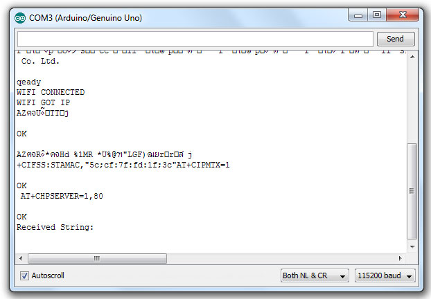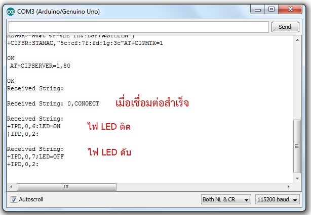 เปิด Serial Monitor ของ Arduino ตั้งค่า baud rate 115200 และปรับช่องในรูปให้เป็น Both NL&CR