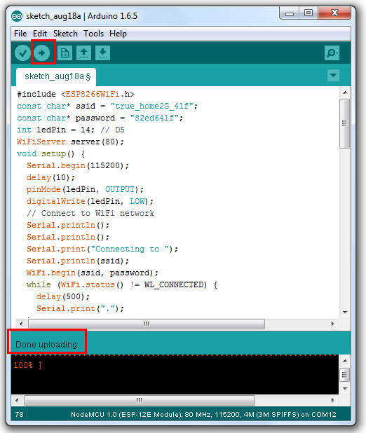 แล้วจึงอัพโหลดโค้ดที่แก้ไขแล้ว เข้าไปยัง NodeMCU V2