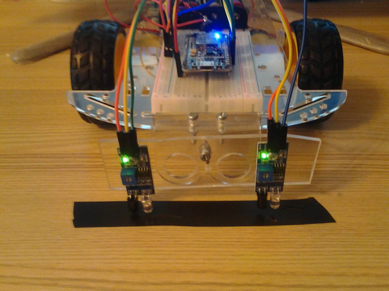 โปรเจค หุ่นยนต์เดินตามเส้น ESP8266 NodeMCU V2 นี้ เราจะใช้ 2 เซ็นเซอร์อินฟราเรด คือด้านซ้ายและด้านขวา โดย เมื่อเซ็นเซอร์ ทั้งด้านซ้ายและด้านขวา ตรวจสอบแล้วเป็นพื้นสีขาว ลำแสง สามารถสะท้อนกลับมาได้ทั้งคู่ ( 0 , 0 ) ให้หุ่นยนต์เคลื่อนที่ไปข้างหน้า