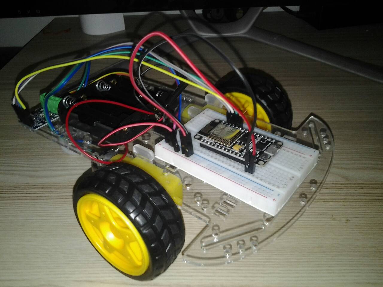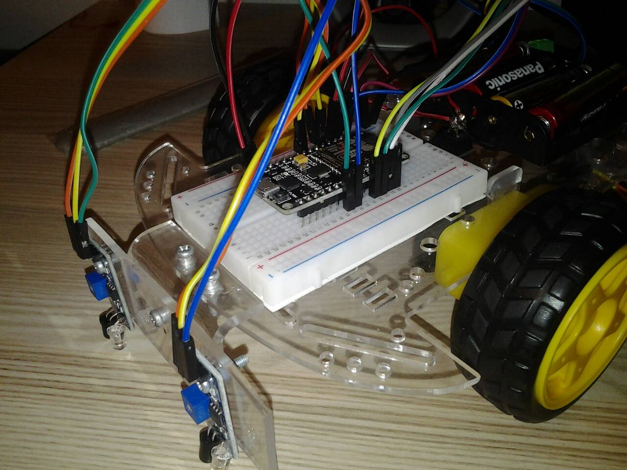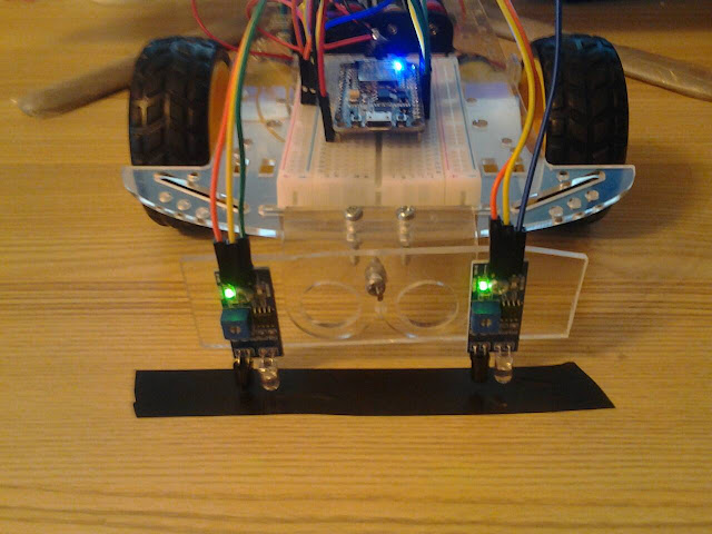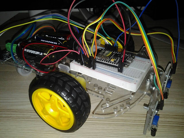 หุ่นยนต์และมนุษย์มีหลักการทำงานที่เหมือนกัน คือ หน่วยรับข้อมูลเข้า (Input Unit) หน่วยประมวลผล (Process Unit) และหน่วยแสดงผล (Output Unit) ดังนั้นการที่หุ่นยนต์จะเคลื่อนที่ไปให้ตรงเป้าหมาย หุ่นยนต์จะต้องมีอุปกรณ์ที่จะตรวจสอบตำแหน่งและส่งข้อมูลที่ได้ไปยังหน่วยประมวลผล เพื่อให้มอเตอร์ทำการแสดงผลโดยการไปยังเป้าหมายต่อไป อุปกรณ์พื้นฐานที่ใช้ในการตรวจสอบตำแหน่งนั้น คือ โมดูลเซ็นเซอร์แสงสำหรับตรวจจับวัตถุกีดขวาง เซ็นเซอร์ตรวจสอบการสะท้อนแสงกลับมา ได้หรือไม่ แล้วส่งสัญญาณไปยัง ESP8266 แล้ว ESP8266 จึงไปสั่งให้มอเตอร์ทำงาน โดย Motor Driver Module HG7881 ให้เป็นไปตามการส่งค่ามาของเซ็นเซอร์