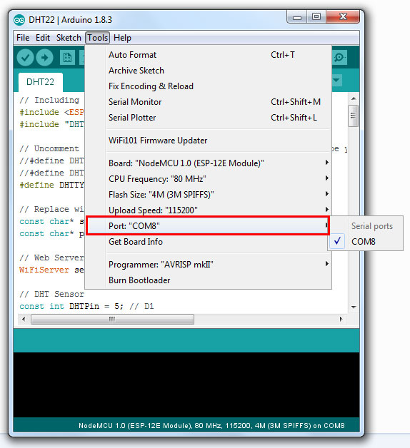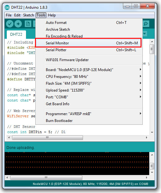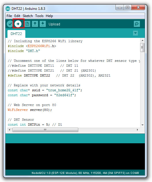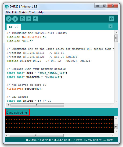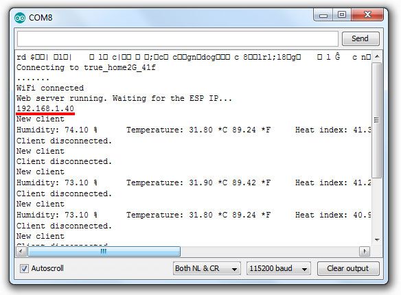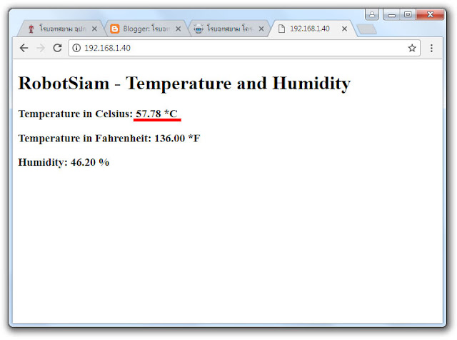 // Including the ESP8266 WiFi library #include <ESP8266WiFi.h> #include "DHT.h" // Uncomment one of the lines below for whatever DHT sensor type you're using! //#define DHTTYPE DHT11 // DHT 11 //#define DHTTYPE DHT21 // DHT 21 (AM2301) #define DHTTYPE DHT22 // DHT 22 (AM2302), AM2321 // Replace with your network details const char* ssid = "YOUR_NETWORK_NAME"; const char* password = "YOUR_NETWORK_PASSWORD"; // Web Server on port 80 WiFiServer server(80); // DHT Sensor const int DHTPin = 5; // D1 // Initialize DHT sensor. DHT dht(DHTPin, DHTTYPE); // Temporary variables static char celsiusTemp[7]; static char fahrenheitTemp[7]; static char humidityTemp[7]; // only runs once on boot void setup() { // Initializing serial port for debugging purposes Serial.begin(115200); delay(10); dht.begin(); // Connecting to WiFi network Serial.println(); Serial.print("Connecting to "); Serial.println(ssid); WiFi.begin(ssid, password); while (WiFi.status() != WL_CONNECTED) { delay(500); Serial.print("."); } Serial.println(""); Serial.println("WiFi connected"); // Starting the web server server.begin(); Serial.println("Web server running. Waiting for the ESP IP..."); delay(10000); // Printing the ESP IP address Serial.println(WiFi.localIP()); } // runs over and over again void loop() { // Listenning for new clients WiFiClient client = server.available(); if (client) { Serial.println("New client"); // bolean to locate when the http request ends boolean blank_line = true; while (client.connected()) { if (client.available()) { char c = client.read(); if (c == '\n' && blank_line) { // Sensor readings may also be up to 2 seconds 'old' (its a very slow sensor) float h = dht.readHumidity(); // Read temperature as Celsius (the default) float t = dht.readTemperature(); // Read temperature as Fahrenheit (isFahrenheit = true) float f = dht.readTemperature(true); // Check if any reads failed and exit early (to try again). if (isnan(h) || isnan(t) || isnan(f)) { Serial.println("Failed to read from DHT sensor!"); strcpy(celsiusTemp,"Failed"); strcpy(fahrenheitTemp, "Failed"); strcpy(humidityTemp, "Failed"); } else{ // Computes temperature values in Celsius + Fahrenheit and Humidity float hic = dht.computeHeatIndex(t, h, false); dtostrf(hic, 6, 2, celsiusTemp); float hif = dht.computeHeatIndex(f, h); dtostrf(hif, 6, 2, fahrenheitTemp); dtostrf(h, 6, 2, humidityTemp); // You can delete the following Serial.print's, it's just for debugging purposes Serial.print("Humidity: "); Serial.print(h); Serial.print(" %\t Temperature: "); Serial.print(t); Serial.print(" *C "); Serial.print(f); Serial.print(" *F\t Heat index: "); Serial.print(hic); Serial.print(" *C "); Serial.print(hif); Serial.print(" *F"); Serial.print("Humidity: "); Serial.print(h); Serial.print(" %\t Temperature: "); Serial.print(t); Serial.print(" *C "); Serial.print(f); Serial.print(" *F\t Heat index: "); Serial.print(hic); Serial.print(" *C "); Serial.print(hif); Serial.println(" *F"); } client.println("HTTP/1.1 200 OK"); client.println("Content-Type: text/html"); client.println("Connection: close"); client.println(); // your actual web page that displays temperature and humidity client.println("<!DOCTYPE HTML>"); client.println("<html>"); client.println("<head></head><body><h1>RobotSiam - Temperature and Humidity</h1><h3>Temperature in Celsius: "); client.println(celsiusTemp); client.println("*C</h3><h3>Temperature in Fahrenheit: "); client.println(fahrenheitTemp); client.println("*F</h3><h3>Humidity: "); client.println(humidityTemp); client.println("%</h3><h3>"); client.println("</body></html>"); break; } if (c == '\n') { // when starts reading a new line blank_line = true; } else if (c != '\r') { // when finds a character on the current line blank_line = false; } } } // closing the client connection delay(1); client.stop(); Serial.println("Client disconnected."); } }