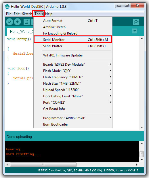 โดยตัวเลขที่อยู่ในวงเล็บคือค่าความเร็วในการรับ-ส่งข้อมูล ค่ามาตรฐานสำหรับ ESP32 คือ 115200