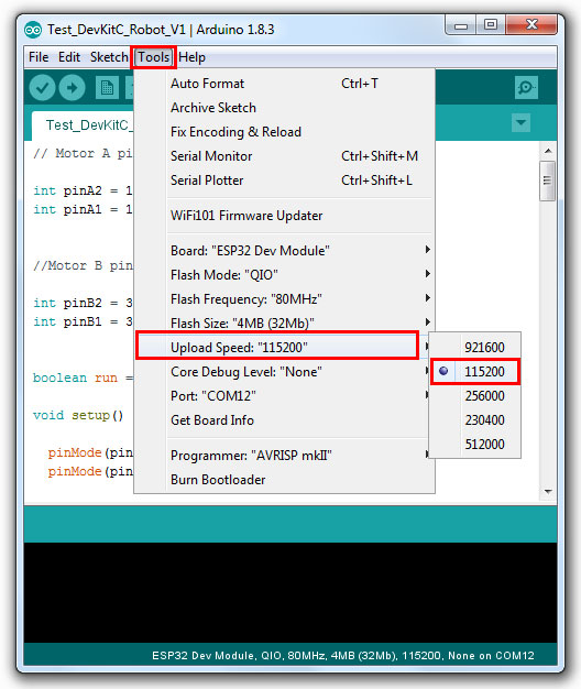 ไปที่ Tools -> Upload Speed : เลือกเป็น "115200"
