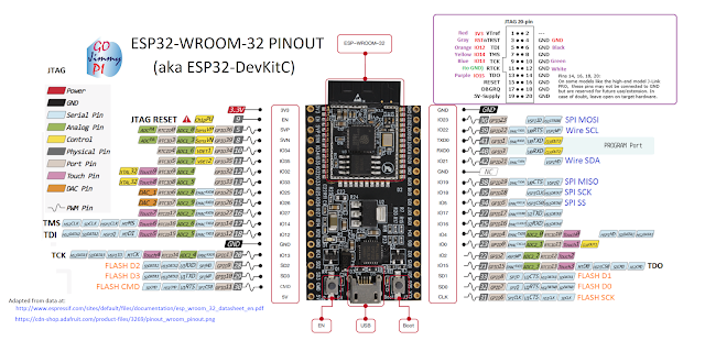 การกำหนดขา GPIO ของ DevKitC ESP32 โดยดูได้จาก PINOUT ของ DevKitC ESP32 ตามภาพด้านล่าง