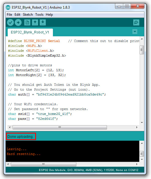 /* Blynk app controlled Robot with DevKitC ESP32. For more details visit: https://robotsiam.blogspot.com/2017/11/esp32-7-devkitc-esp32.html */ #define BLYNK_PRINT Serial // Comment this out to disable prints and save space #include <WiFi.h> #include <WiFiClient.h> #include <BlynkSimpleEsp32.h> //pins to drive motors int MotorLeft[2] = {12, 13}; int MotorRight[2] = {33, 32}; // You should get Auth Token in the Blynk App. // Go to the Project Settings (nut icon). char auth[] = "blynk_key"; // Your WiFi credentials. // Set password to "" for open networks. char ssid[] = "wifi_SSID"; char pass[] = "wifi_password"; void setup() { Serial.begin(115200); Blynk.begin(auth, ssid, pass); MotorInit(); //Serial.print("*Explore Robo Mode Computer: Controlled*\n\r"); //Serial.println("Commands:\n W->Forward \n S->Backwards \n A->Left \n D->Right"); } void loop() { Blynk.run(); } //Intialize the motor void MotorInit() { int i; for (i = 0 ; i < 2; i++) { pinMode(MotorLeft[i], OUTPUT); pinMode(MotorRight[i], OUTPUT); } } //Robot Driving Functions void Robot_Forward() { digitalWrite(MotorLeft[0], 0); digitalWrite(MotorLeft[1], 1); digitalWrite(MotorRight[0], 1); digitalWrite(MotorRight[1], 0); } void Robot_Backward() { digitalWrite(MotorLeft[0], 1); digitalWrite(MotorLeft[1], 0); digitalWrite(MotorRight[0], 0); digitalWrite(MotorRight[1], 1); } void Robot_Left() { digitalWrite(MotorLeft[0], 1); digitalWrite(MotorLeft[1], 0); digitalWrite(MotorRight[0], 1); digitalWrite(MotorRight[1], 0); } void Robot_Right() { digitalWrite(MotorLeft[0], 0); digitalWrite(MotorLeft[1], 1); digitalWrite(MotorRight[0], 0); digitalWrite(MotorRight[1], 1); } void Robot_Stop() { digitalWrite(MotorLeft[0], 0); digitalWrite(MotorLeft[1], 0); digitalWrite(MotorRight[0], 0); digitalWrite(MotorRight[1], 0); } BLYNK_WRITE(V1) { int value = param.asInt(); // Get value as integer // Serial.println("Going Forward"); if (value) { Robot_Forward(); } } BLYNK_WRITE(V2) { int value = param.asInt(); // Get value as integer //Serial.println("Moving Left"); if (value) { Robot_Left(); delay(200); Robot_Stop(); } } BLYNK_WRITE(V3) { int value = param.asInt(); // Get value as integer // Serial.println("Going back"); if (value) { Robot_Backward(); } } BLYNK_WRITE(V4) { int value = param.asInt(); // Get value as integer //Serial.println("Moving Right"); if (value) { Robot_Right(); delay(200); Robot_Stop(); } } BLYNK_WRITE(V5) { int value = param.asInt(); // Get value as integer // Serial.println("Braking!!"); if (value) { Robot_Stop(); } }