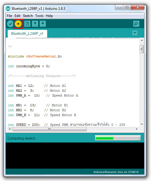 ก่อน Upload ให้ถอดการเชื่อมต่อสาย TX และ RX ออกจาก L298P (ถ้าไม่ถอดออก อาจมีปัญหาในการ Upload)