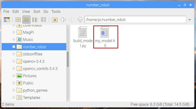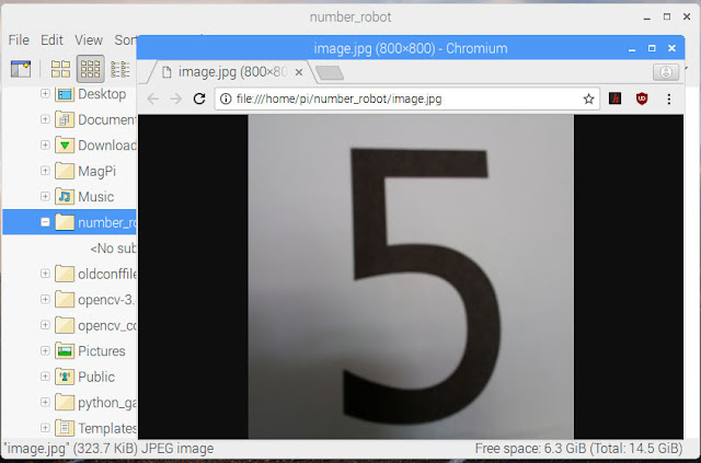 สร้างไฟล์ robot_number.py โดย เปิดโปรแกรม Python 3 (IDLE) เขียนโค้ดดังนี้ import RPi.GPIO as GPIO #set GPIO numbering mode and define output pins GPIO.setmode(GPIO.BOARD) GPIO.setup(11,GPIO.OUT) GPIO.setup(13,GPIO.OUT) GPIO.setup(35,GPIO.OUT) GPIO.setup(37,GPIO.OUT) from time import sleep from picamera import PiCamera camera = PiCamera() camera.resolution = (800, 800) camera.start_preview() sleep(2) camera.capture('/home/pi/number_robot/image.jpg') from skimage.io import imread import numpy as np im = imread("image.jpg") from skimage.transform import resize # resize to 28 x 28 im_resize = resize(im,(28,28), mode='constant') from skimage.color import rgb2gray # turn the image from color to gray im_gray = rgb2gray(im_resize) # the color of the original set are inverted,so we invert it here im_gray_invert = 255 - im_gray*255 #treat color under threshold as black im_gray_invert[im_gray_invert<=90] = 0 from keras.models import load_model model=load_model('my_model.h5') im_final = im_gray_invert.reshape(1,1,28,28) # the below output is a array of possibility of respective digit ans = model.predict(im_final) print(ans) ans = ans[0].tolist().index(max(ans[0].tolist())) print("the predicted digit is",ans) if ans == 8: GPIO.output(11,False) GPIO.output(13,False) GPIO.output(35,False) GPIO.output(37,False) elif ans == 2: GPIO.output(11,True) GPIO.output(13,False) GPIO.output(35,True) GPIO.output(37,False) sleep(0.3) GPIO.output(11,False) GPIO.output(13,False) GPIO.output(35,False) GPIO.output(37,False) elif ans == 3: GPIO.output(11,False) GPIO.output(13,True) GPIO.output(35,False) GPIO.output(37,True) sleep(0.4) GPIO.output(11,False) GPIO.output(13,False) GPIO.output(35,False) GPIO.output(37,False) elif ans == 4: GPIO.output(11,True) GPIO.output(13,False) GPIO.output(35,False) GPIO.output(37,False) sleep(0.4) GPIO.output(11,False) GPIO.output(13,False) GPIO.output(35,False) GPIO.output(37,False) elif ans == 5: GPIO.output(11,False) GPIO.output(13,False) GPIO.output(35,True) GPIO.output(37,False) sleep(0.4) GPIO.output(11,False) GPIO.output(13,False) GPIO.output(35,False) GPIO.output(37,False) else: GPIO.output(11,False) GPIO.output(13,False) GPIO.output(35,False) GPIO.output(37,False) GPIO.cleanup() หรือดาวน์โหลดโค้ดจากลิงค์ด้านล่าง https://drive.google.com/open?id=1IgsAd5Utat5Nhptxw4qU2C67Hg9I0r4s Save ไปที่ โฟลเดอร์ number_robot และตั้งชื่อเป็น robot_number.py