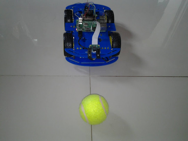 ####### # Author: RobotSiam.com # Date: 22 September 2018 ####### # import the necessary packages from __future__ import print_function from imutils.video import VideoStream import argparse import imutils import time import cv2 import os import RPi.GPIO as GPIO #set GPIO numbering mode and define output pins GPIO.setmode(GPIO.BOARD) GPIO.setwarnings(False) GPIO.setup(11,GPIO.OUT) GPIO.setup(13,GPIO.OUT) GPIO.setup(35,GPIO.OUT) GPIO.setup(37,GPIO.OUT) def forWard(): print("Going Forwards") GPIO.output(11,True) GPIO.output(13,False) GPIO.output(35,True) GPIO.output(37,False) time.sleep(0.1) GPIO.output(11,False) GPIO.output(13,False) GPIO.output(35,False) GPIO.output(37,False) def backWard(): print("Going Backwards") GPIO.output(11,False) GPIO.output(13,True) GPIO.output(35,False) GPIO.output(37,True) time.sleep(0.1) GPIO.output(11,False) GPIO.output(13,False) GPIO.output(35,False) GPIO.output(37,False) def turnRight(): print("Going Right") GPIO.output(11,False) GPIO.output(13,False) GPIO.output(35,True) GPIO.output(37,False) time.sleep(0.1) GPIO.output(11,False) GPIO.output(13,False) GPIO.output(35,False) GPIO.output(37,False) def turnLeft(): print("Going Left") GPIO.output(11,True) GPIO.output(13,False) GPIO.output(35,False) GPIO.output(37,False) time.sleep(0.1) GPIO.output(11,False) GPIO.output(13,False) GPIO.output(35,False) GPIO.output(37,False) def Stop(): print("Stopping") GPIO.output(11,False) GPIO.output(13,False) GPIO.output(35,False) GPIO.output(37,False) # position servos to present object at center of the frame def mapPosition (x, y): if (x < 200): turnLeft() elif (x > 300): turnRight() elif (x >= 200 and x <= 300): forWard() # initialize the video stream and allow the camera sensor to warmup print("[INFO] waiting for camera to warmup...") vs = VideoStream(0).start() time.sleep(2.0) # define the lower and upper boundaries of the object # to be tracked in the HSV color space colorLower = (22, 100, 100) colorUpper = (42, 255, 255) # loop over the frames from the video stream while True: # grab the next frame from the video stream, Invert 180o, resize the # frame, and convert it to the HSV color space frame = vs.read() frame = imutils.resize(frame, width=500) frame = imutils.rotate(frame, angle=0) hsv = cv2.cvtColor(frame, cv2.COLOR_BGR2HSV) # construct a mask for the object color, then perform # a series of dilations and erosions to remove any small # blobs left in the mask mask = cv2.inRange(hsv, colorLower, colorUpper) mask = cv2.erode(mask, None, iterations=2) mask = cv2.dilate(mask, None, iterations=2) # find contours in the mask and initialize the current # (x, y) center of the object cnts = cv2.findContours(mask.copy(), cv2.RETR_EXTERNAL, cv2.CHAIN_APPROX_SIMPLE) cnts = cnts[0] if imutils.is_cv2() else cnts[1] center = None # only proceed if at least one contour was found if len(cnts) > 0: # find the largest contour in the mask, then use # it to compute the minimum enclosing circle and # centroid c = max(cnts, key=cv2.contourArea) ((x, y), radius) = cv2.minEnclosingCircle(c) M = cv2.moments(c) center = (int(M["m10"] / M["m00"]), int(M["m01"] / M["m00"])) # only proceed if the radius meets a minimum size if radius > 10: # draw the circle and centroid on the frame, # then update the list of tracked points cv2.circle(frame, (int(x), int(y)), int(radius), (0, 255, 255), 2) cv2.circle(frame, center, 5, (0, 0, 255), -1) # position Servo at center of circle mapPosition(int(x), int(y)) # show the frame to our screen cv2.imshow("Frame", frame) # if [ESC] key is pressed, stop the loop key = cv2.waitKey(1) & 0xFF if key == ord("q"): break # do a bit of cleanup print("\n [INFO] Exiting Program and cleanup stuff \n") Stop() GPIO.cleanup() cv2.destroyAllWindows() vs.stop() หรือดาวน์โหลดโค้ดจากลิงค์ด้านล่าง https://drive.google.com/open?id=1vS7fyTyQcsKD5ECAk4a3dcjlPopU2Q0S Save ไปที่ โฟลเดอร์ tracking_robot และตั้งชื่อเป็น following_robot.py