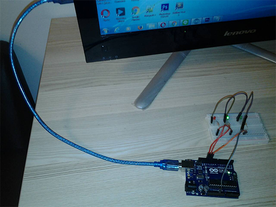 และรูปด้านล่างคือรูปของการต่อวงจรด้วยอุปกรณ์ต่างๆบน Breadboard การต่อไม่จำเป็นต้องต่อตามภาพ สามารถจะตอเป็นรูปแบบไหนก็ได้ ขอเพียงให้ถูกต้องตามวงจร ก็จะสามารถทำงานได้เช่นเดียวกัน
