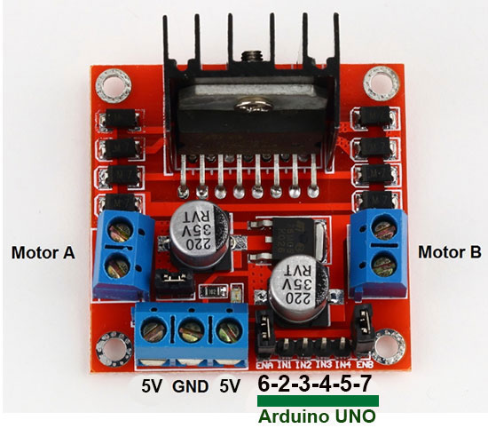 สำหรับโมดุล PWM ของ Arduino มีความละเอียด 8 bit หรือ ปรับได้ 255 ระดับ ดังนั้นค่าสัญญาณ 0 โวลต์ถึง 5 โวลต์ จะถูกแสดงเป็นสัญญาณแบบดิจิตอล จะได้ 0 ถึง 255 ซึ่งเราสามารถเทียบสัดส่วนคำนวนจากเลขจริง เป็น เลขทางดิจิตอลได้ตัวอย่างถ้า 5V = 255 1.0v จะเท่ากับค่าเท่าไร = 255/5.0V*1.0V = 51L298N Dual Full-bridge motor driver module (Red PCB) และการต่อวงจร กับ Arduino UNO R3 (ขา ENA และ ENB ถ้ามี Jumper ต่ออยู่ให้ถอดออก)
