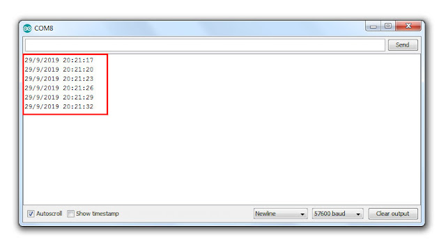 2.12 Serial Monitor แสดงวันที่ และ เวลาปัจจุบัน ตามคอมพิวเตอร์ ที่คอมไพล์ แสดงว่า Module นาฬิกา DS3231 พร้อมทำงานแล้ว