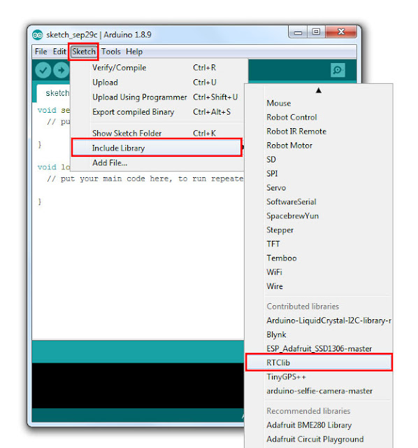 2.4 ตรวจสอบที่ Skecth -> Include Library จะพบ ไลบรารี RTClib เพิ่มเข้ามาใน Arduino IDE ของเรา