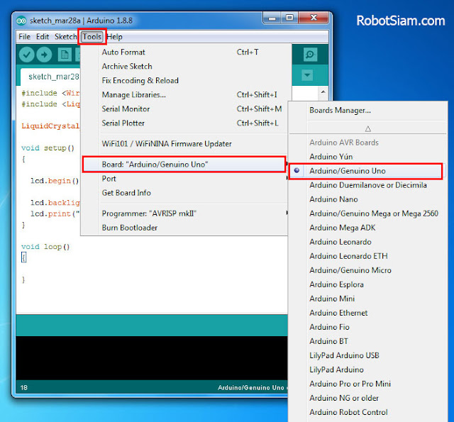 3.7 ไปที่ Tools > Board เลือกเป็น Arduino/Genuino UNO