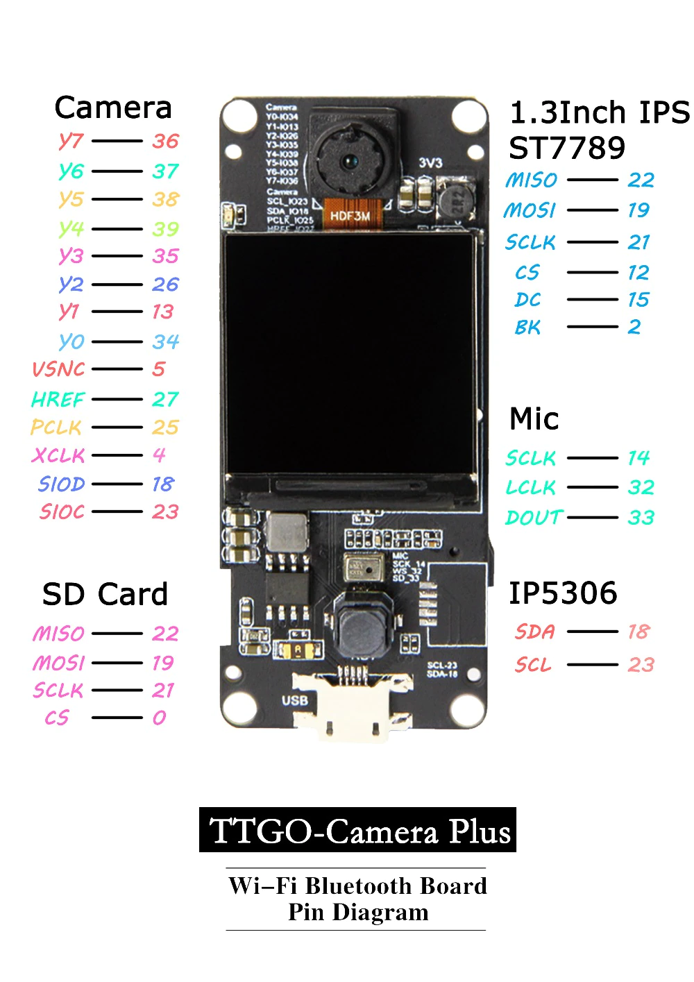 TTGO T-Camera Plus ESP32-DOWDQ6 Display Camera Module บอร์ดพัฒนา ESP32 หน่วยความจำ 4 MB Flash + 8 MB PS-RAM, พร้อมจอภาพ IPS Panel ST7789 ขนาด 1.3 นิ้ว กล้อง OV2640 ความละเอียด 2 ล้านพิเซล (Camera unit OV2640) Normal Lens, SD Card Slot และวงจรชาร์จแบตเตอรี่ (LiPo) และช่องเสียบ MicroSD Card มี หน้าจอแสดงผลแบบ IPS ไมค์โครโฟน MSM261S4030H0 และช่องเสียบแบตเตอรี่กระแสชาร์จ 1A